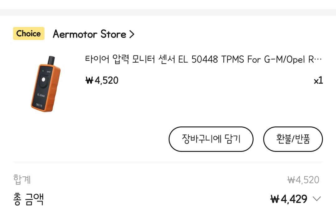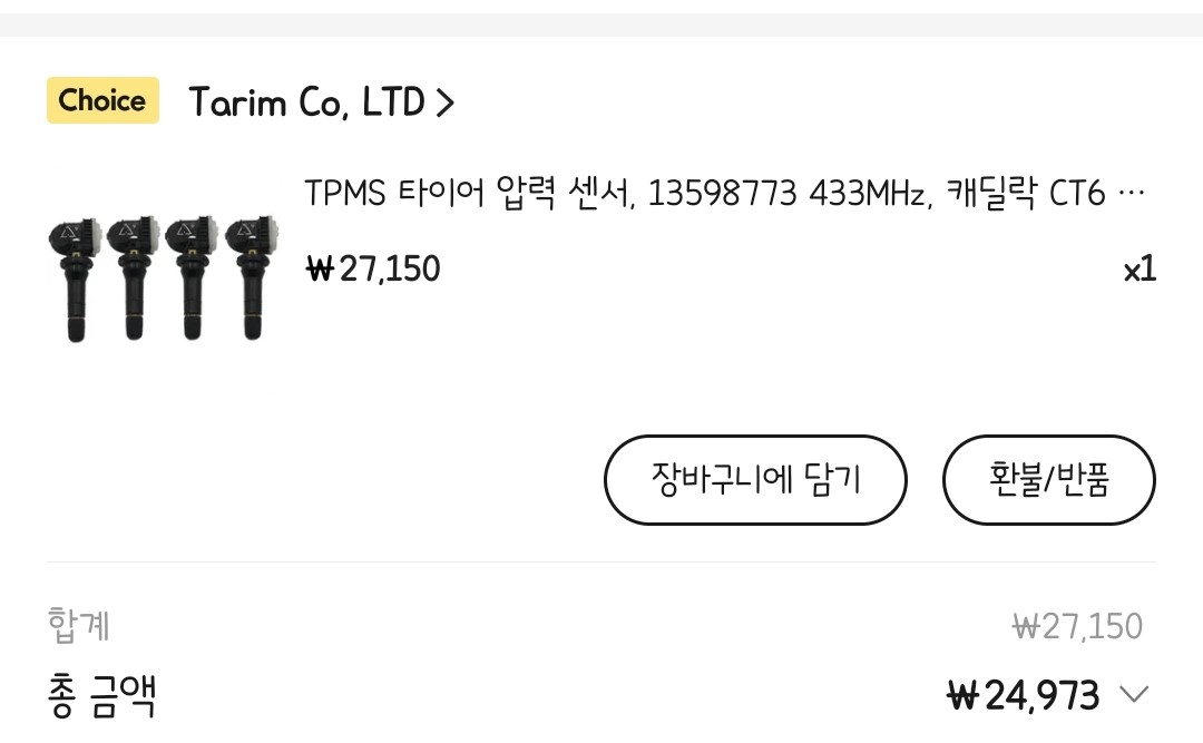 4개에 대략 25,000원 정도였댜. 정품 개당 4만원에 비하면 엄청 저렴하다. 물론 리뷰를 보면 불량도 꽤 있는 듯 보였지만 일단 질러보기로 마음 먹었다. (*2017년 트랙스 기준 13598773, 433MHz를 구매하면 딱맞다.) 이와 더불어 교체 후 TPMS위치 인식 초기화에 필요한 장치도 구입했다.